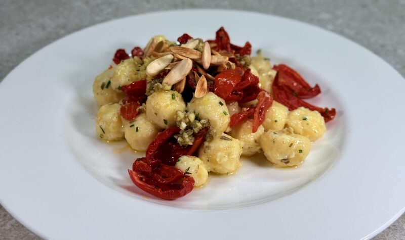 25 min. excluding making confit tomatoesDelicate, tender gnocchi gently glazed with light chive butter, lifted by sweet confit tomatoes and a fine salty crunch of capers and almonds. Ready in about 20–25 minutes total (prep 10–12 min, cooking 8–12 min), it balances freshness and texture without heaviness.