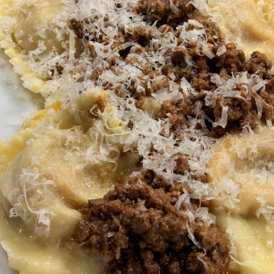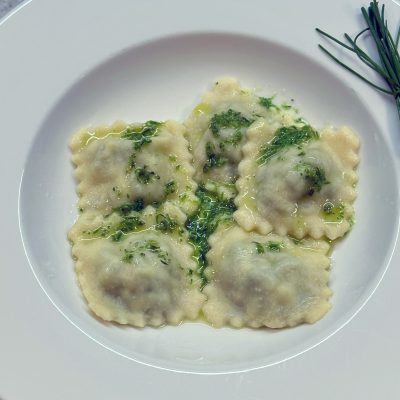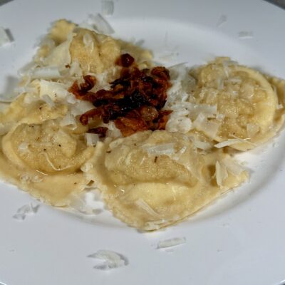 Ravioli filled with ricotta and pecorino cheese with onion cream and crispy pancetta (Leave a review) 35 min. excluded making the ravioli Recipe by Carlo