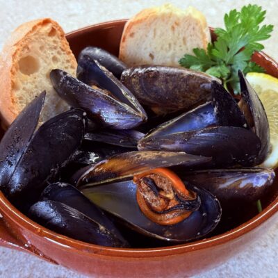 10 mins. excluding cleaning the mussels if you clean them yourself as I do