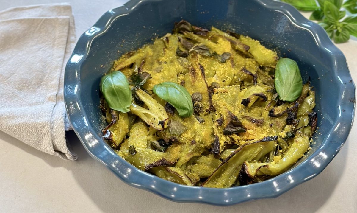 - Cook the peppers at 180° for about 30 minutes in a preheated oven. Meanwhile, drain the capers from their water, and almost at the end of cooking, take the peppers out of the oven and add the capers only now so that they retain their aroma. Put the baking dish with the peppers and capers back in the oven for another 5 minutes, remove it, sprinkle the surface with the breadcrumbs, add the chopped fresh basil with your hands, and mix well.
