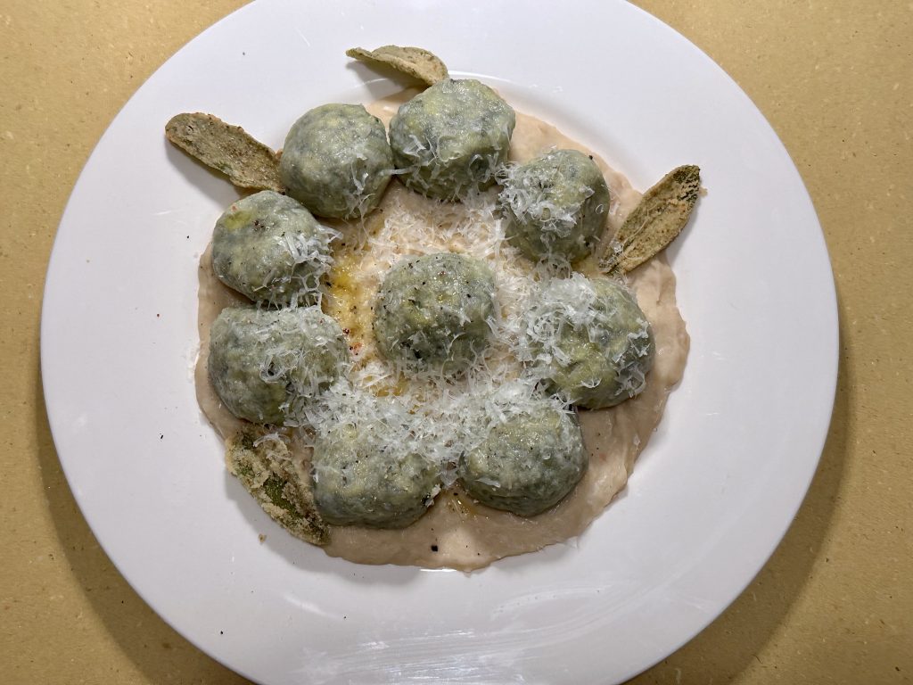 - To serve, place a little cannellini cream on the bottom of the plate (be careful that it is quite soft), lay on top of the gnudi and garnish with pecorino romano, fried sage, a few drops of oil, and a splash of black pepper.