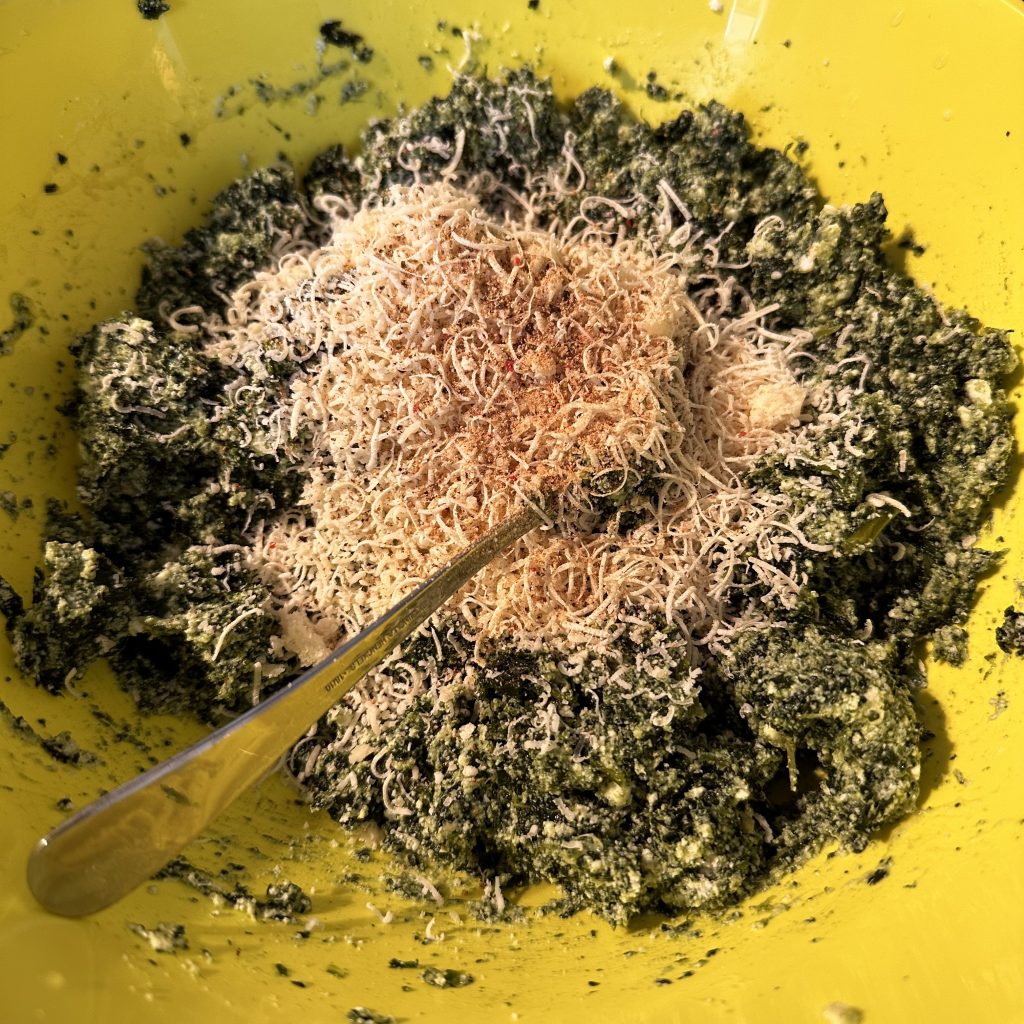 - When the cabbage is cold, also add the well-drained ricotta, Parmigiano Reggiano and the beaten eggs. Also add a generous pinch of grated nutmeg and mix thoroughly with a fork. Taste to regular salt.