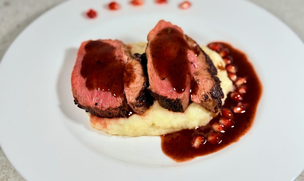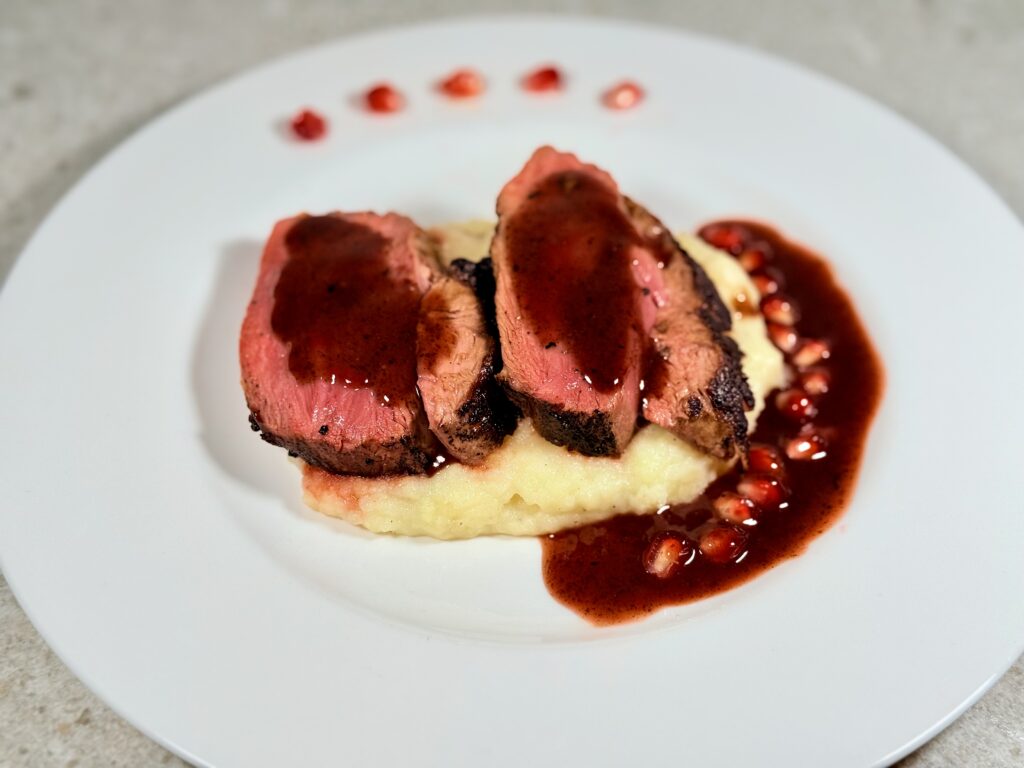 Duck breast has long been a classic of French cuisine, celebrated for its rosy tenderness and rich flavor. Over the years it has also become popular in Italian kitchens, where local chefs embrace it with Mediterranean pairings. This recipe adds a distinctly Tuscan twist: a sweet-and-savory reduction of pomegranate and Vinsanto, the region’s iconic dessert wine. The result is a dish that feels both elegant and comforting — a bridge between French refinement and Italian warmth.