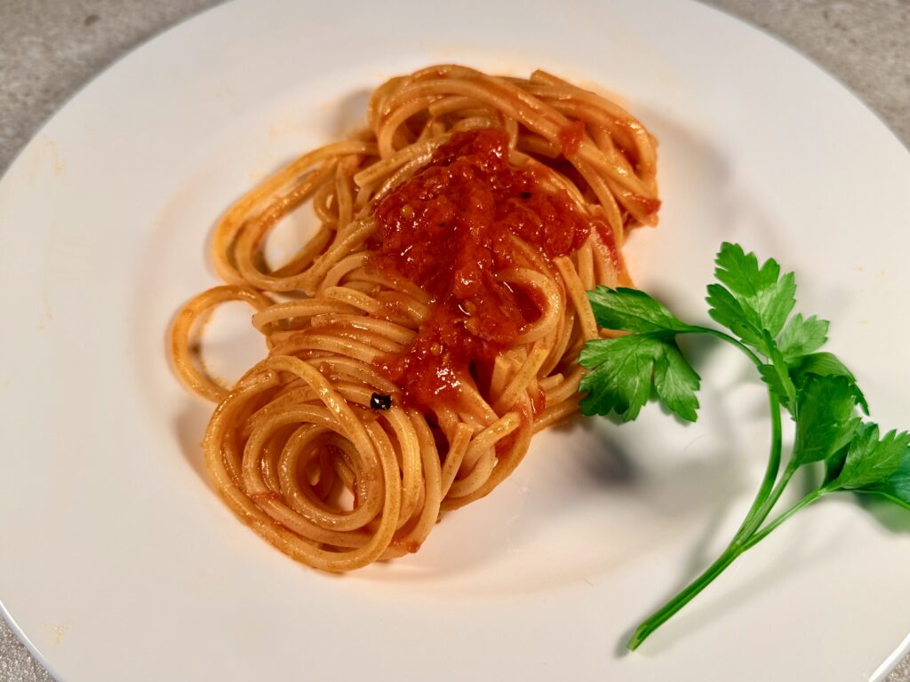 Fresh chitarra spaghetti finished in the pan with a pure tomato sauce made from crushed San Marzano tomatoes, slowly reduced and seasoned only at the end with garlic and basil. Spaghetti al pomodoro are an icon of Italian cuisine—but only if you make them properly: a concentrated sauce, the right timing, and a final toss with starchy pasta water so every strand is coated and glossy. A simple, focused dish where texture, balance, and real tomato flavor are the whole point.