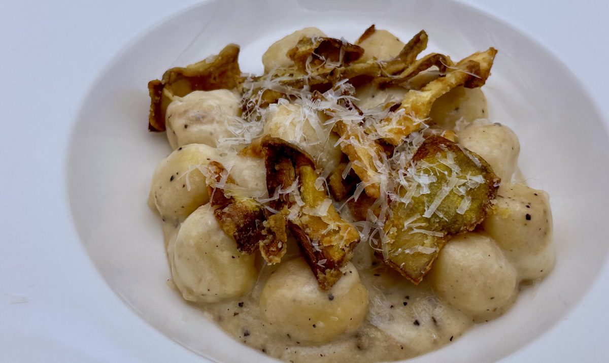 - Finally, serve the Cacio e pepe gnocchi immediately, covering them with the fried artichoke leaves.