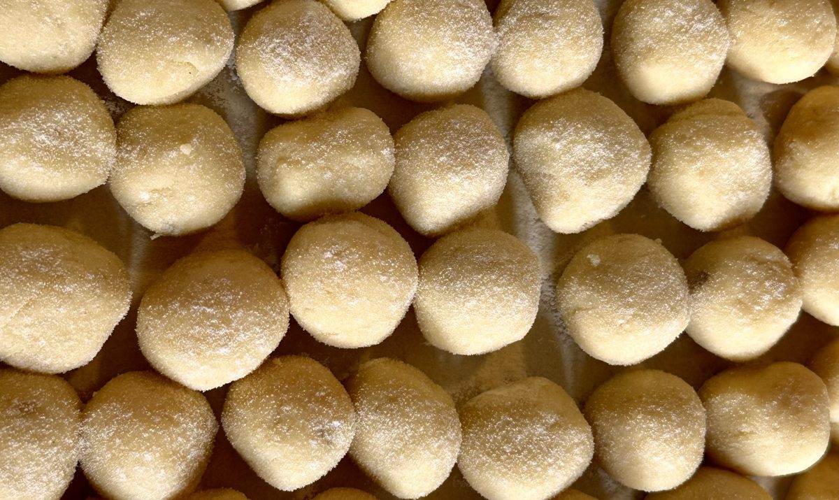 - Take a part of the dough and roll it out with your fingertips to obtain 2 centimeters thick loafs; to do this, help yourself by flouring the pastry board, from time to time, with semolina. In the meantime, cover the remaining dough with a tea towel to prevent it from drying out. Cut the loafs into chunks and place them on a tray with a lightly floured cloth, well spaced from each other. I usually roll them in my hands to give them a more spherical shape, they look nice and they remain more consistent. This is why we also call them potato candies!