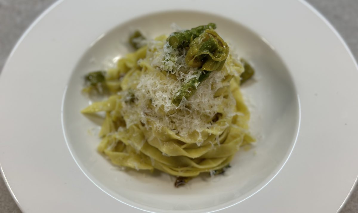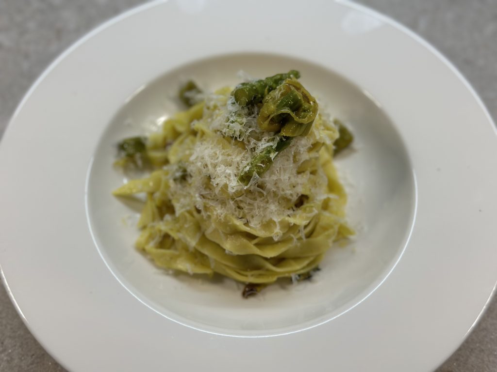- Combine Pasta and Sauce: Add the cooked tagliatelle to the pan with the asparagus mixture. Toss gently to combine, adding a little reserved pasta water if needed to help coat the pasta.
