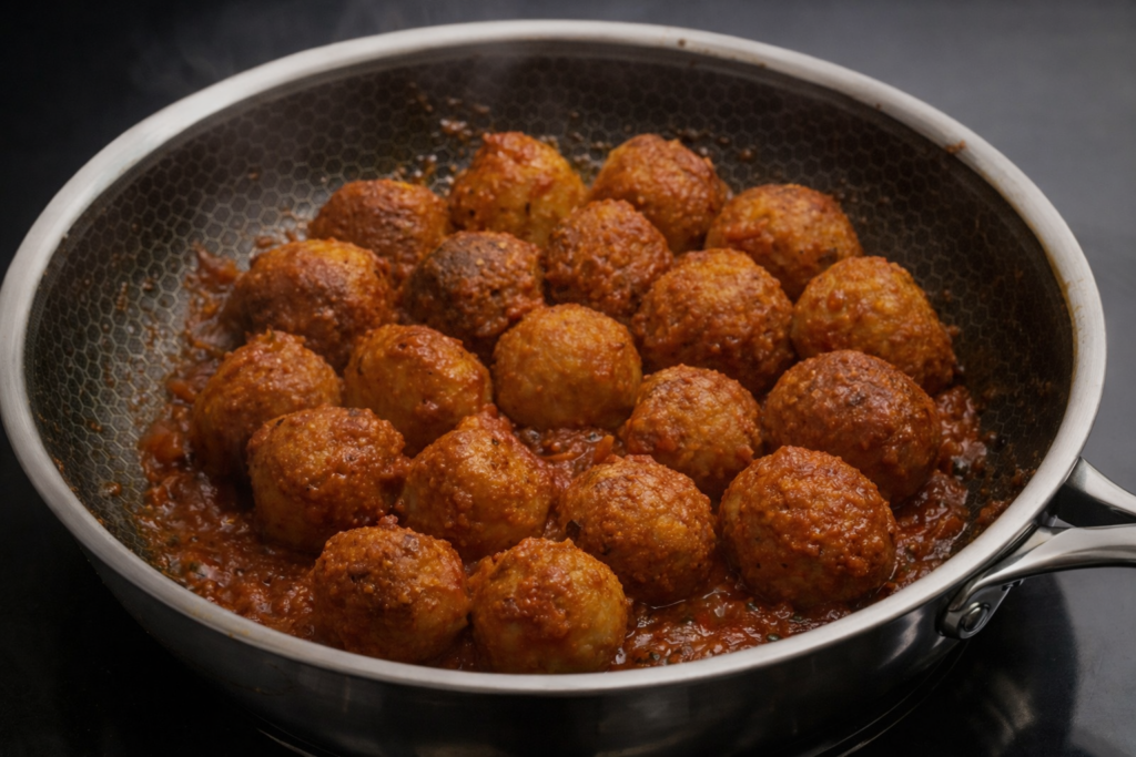 (Optional) Add crushed tomatoes to the pan and simmer briefly. The sauce will soften the meatballs further and add extra flavour.