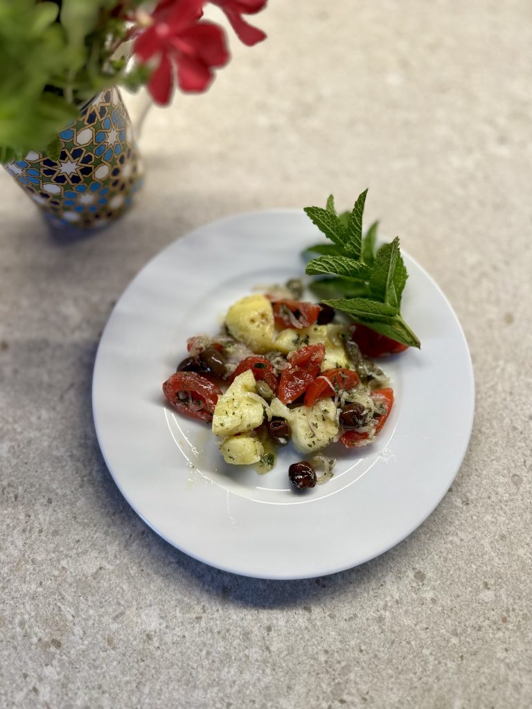 - Pour the onion, cherry tomatoes, olives, and capers into a large bowl.