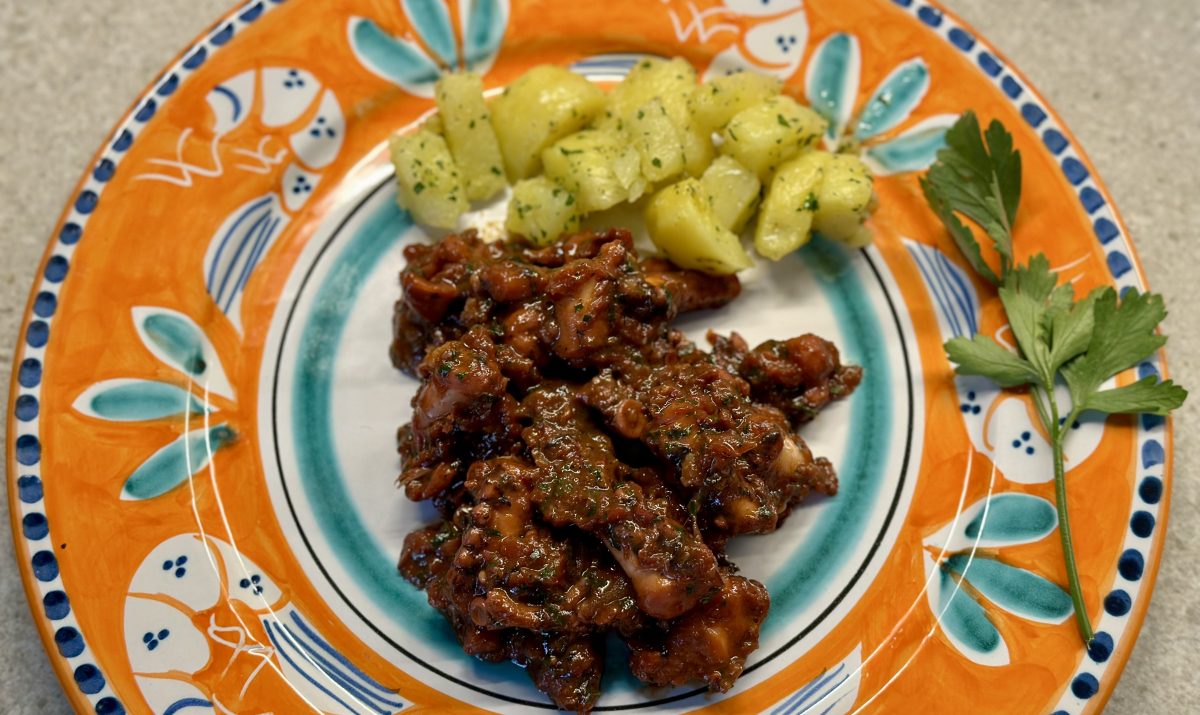 - Brown the octopus with oil in a terracotta pan for 10-15 minutes. Wet with the wine, let it evaporate, then add the tomatoes.