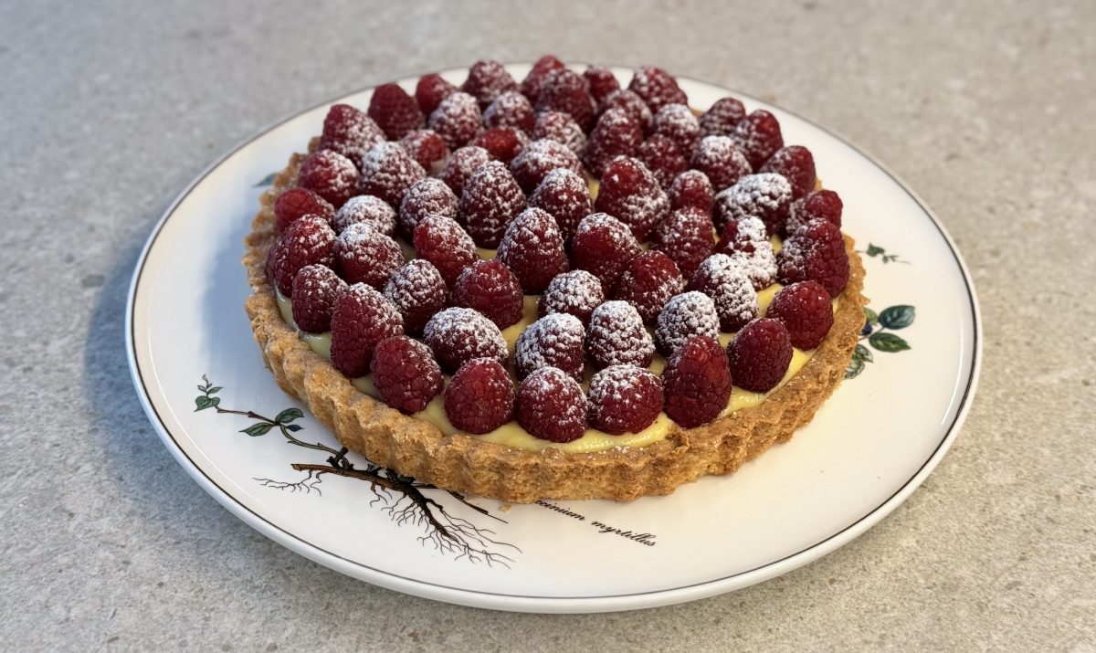 Let the tart base cool completely, then transfer it to a serving plate. Spread an even layer of cream over the base and top with fresh raspberries.