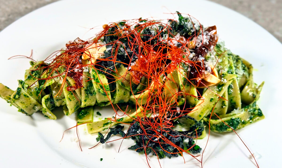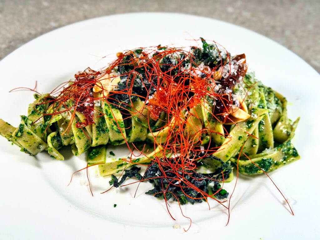 This rustic yet elegant spaghetti dish combines the earthy flavor of Tuscan kale with the sweetness of almonds and sun-dried tomatoes. The creamy kale pesto coats each strand of pasta, while crispy kale leaves and chili threads add a beautiful contrast of texture and color. A drizzle of extra-virgin olive oil and a sprinkle of Parmigiano complete this simple, vibrant, and deeply satisfying Italian recipe — perfect for a cozy dinner or to impress your guests with a touch of Tuscan flair.