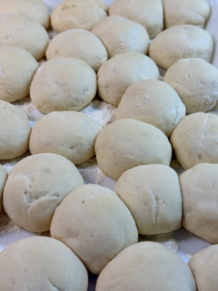 • Turn the dough out and pinch off walnut-sized pieces of about 25–30 g. Round lightly (or leave rough for a more rustic look).- Second rise