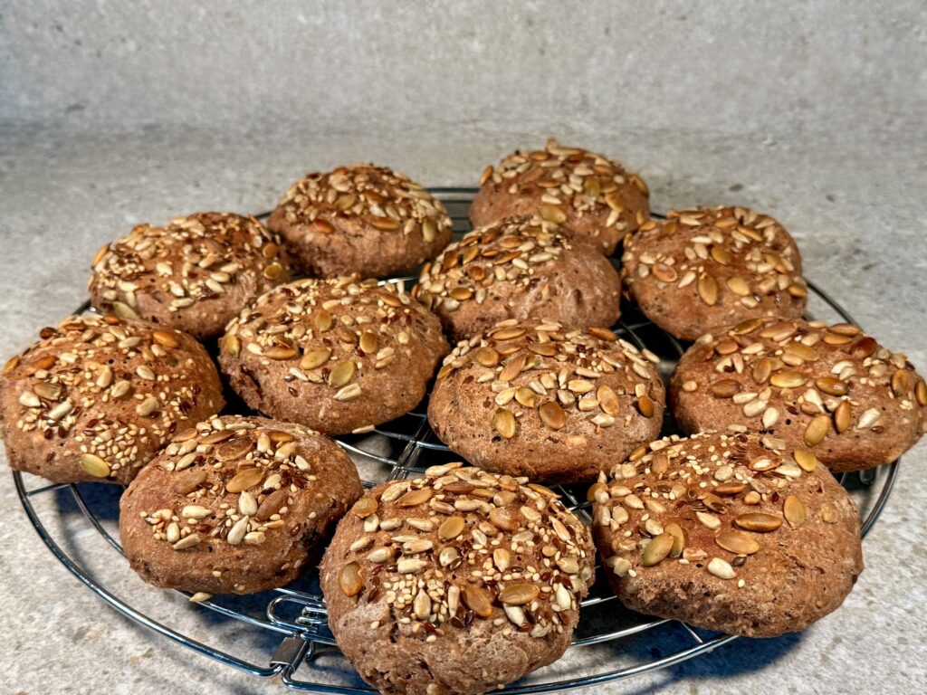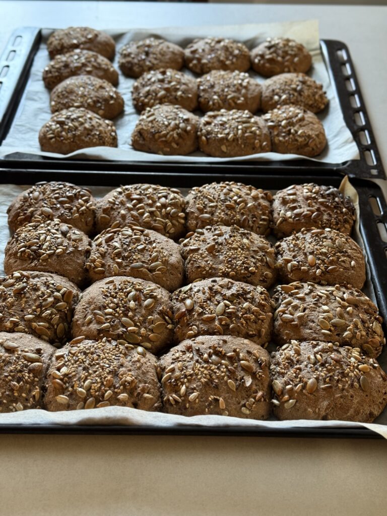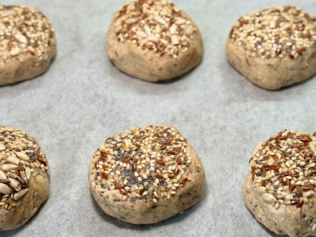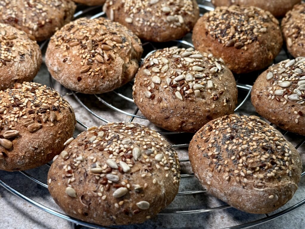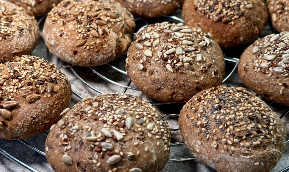 The mix of wholemeal flour, rye, chestnut flour and soaked seeds gives them a rustic character, while honey and malt gently boost the yeast and add a golden crust. They’re healthy — but not the kind of “healthy bread” that tastes like sawdust. They stay soft inside, with a crisp crust and a natural sweetness that pairs beautifully with cheese, cured meats or simply good extra virgin olive oil.