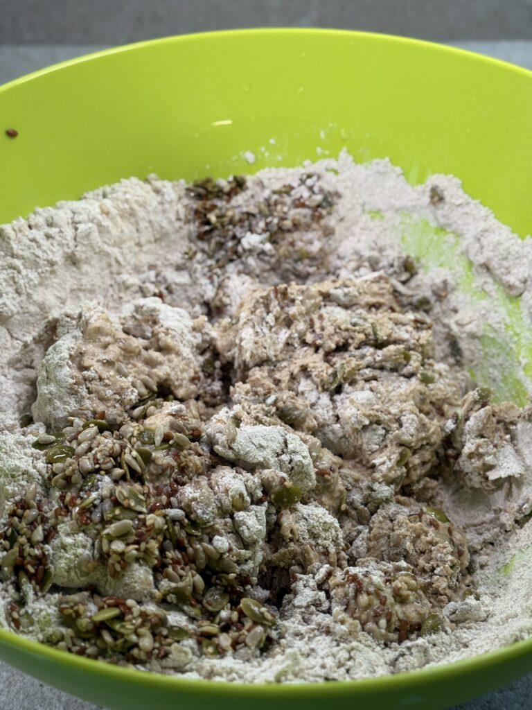 – Mix briefly. After 3–4 minutes, add salt, olive oil, and finally the drained seeds.
